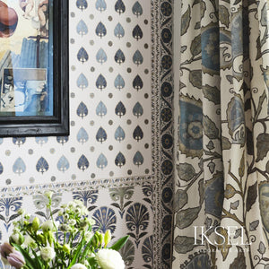 Schumacher Linen Curtains Suzani Paisley Design by Iskel Grey,Blue & White Drapes